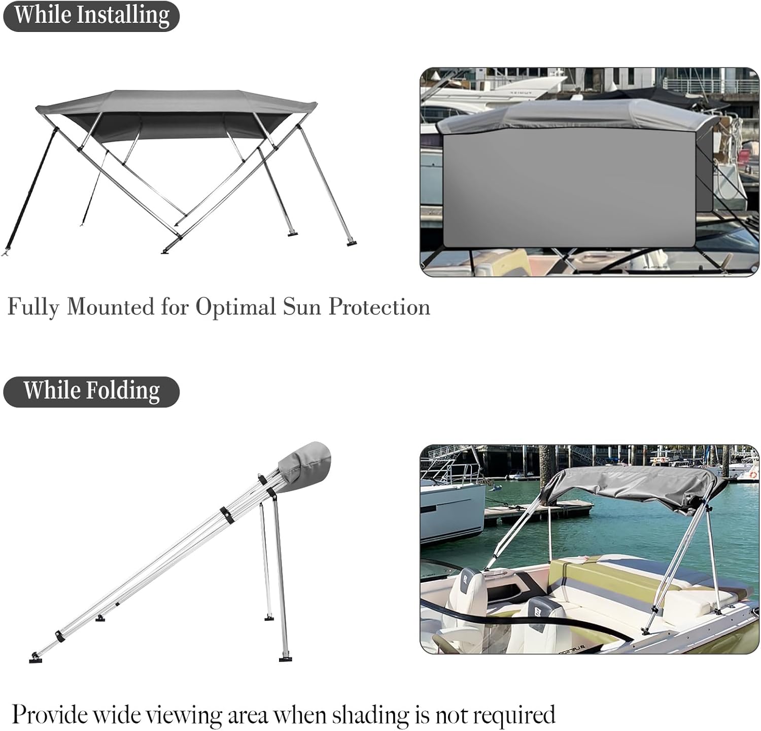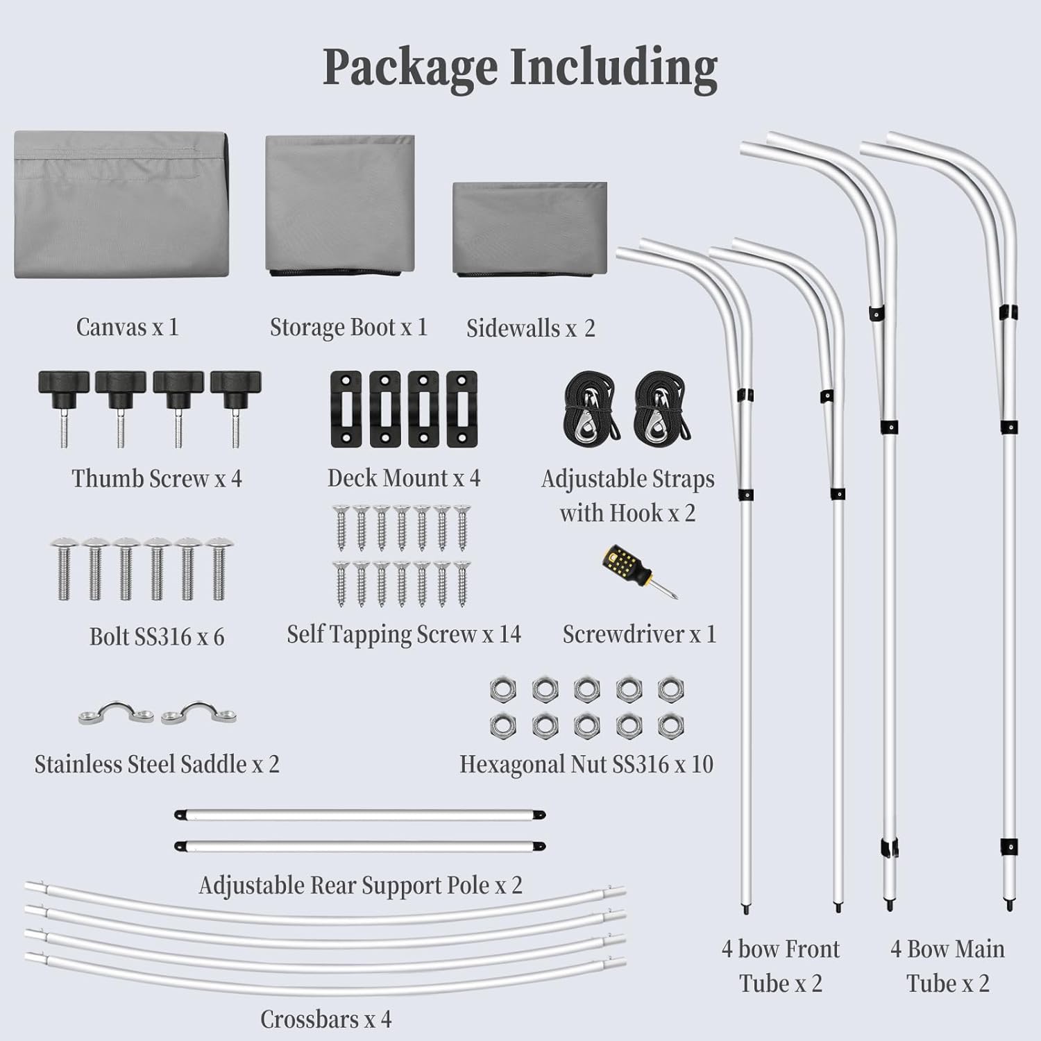 | Item Type Name | STMHOM 4 Bow Bimini Tops for Boat Cover With 1” Aluminum Alloy Frame, Zippered Storage Boot, Pu Coating Canvas,Include 2 Straps, 2 Adjustable Rear Support Pole, |