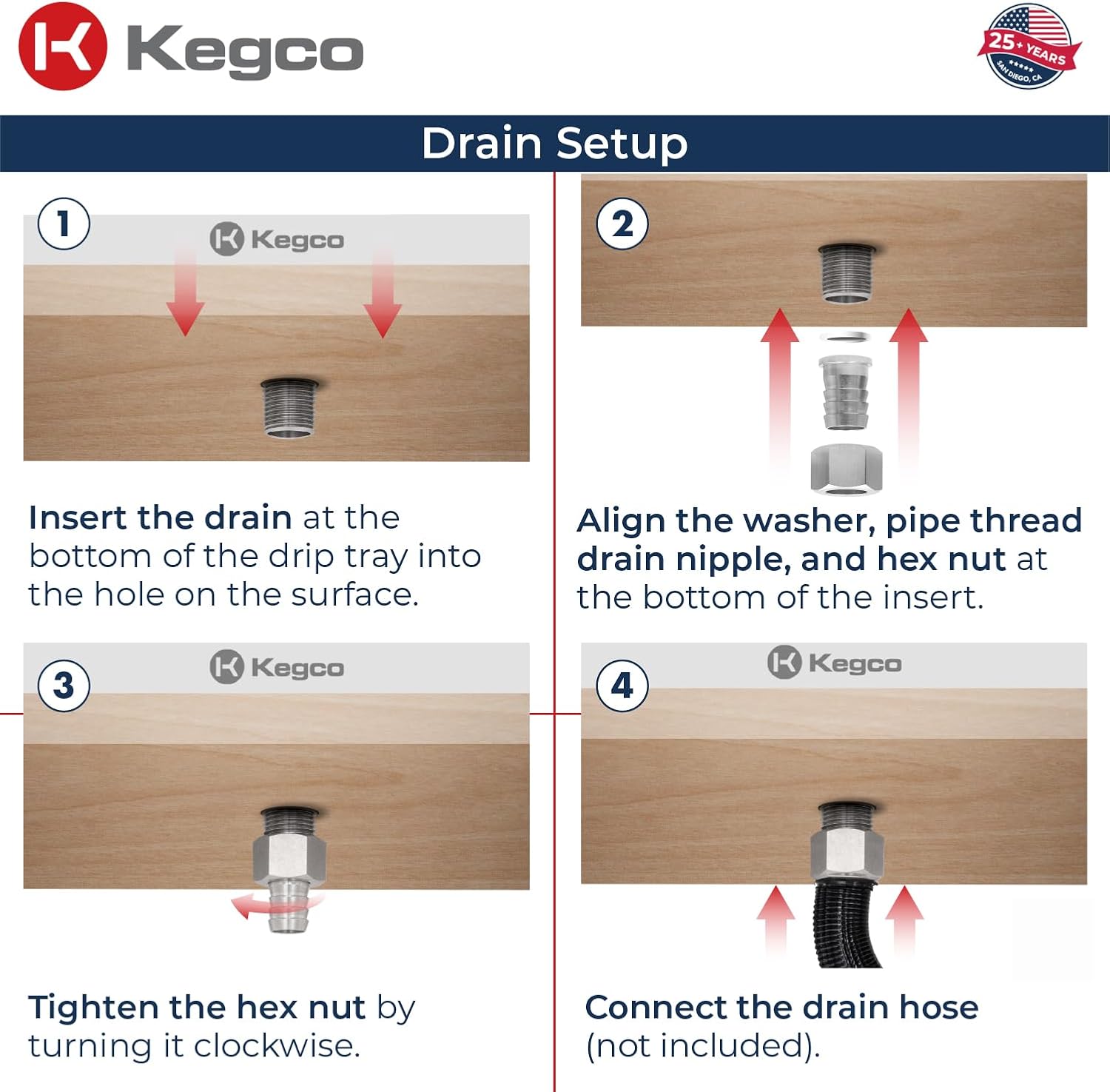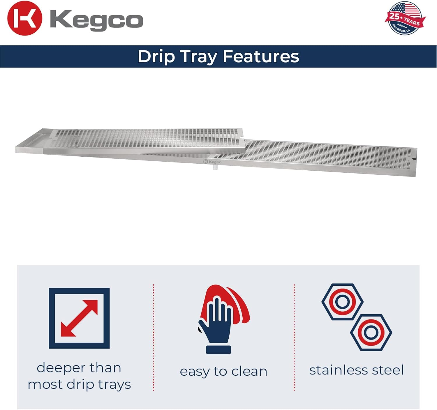 The Kegco SESM-489D 48" x 9" Surface Mount Drip Tray is ideal for use with bar applications where you can run a line from the drip tray to the nearest drain receptacle so you don't have to dump out the drip tray when it fills up. This drip tray is constructed of stainless steel and features welded corners for a safe, smooth finish and two removable louvered screens for easy cleaning. The center mounted solid brass drain includes a threaded brass nipple, a hex nut, and a washer and is capable of attaching to a 1/2" I.D. drain hose. Surface mount drip tray is very long, measuring 48" by 9", making it capable of catching beer runoff of several draft beer faucets at on time. 1/2 Type: Surface Mount Finish: Stainless Steel Dimensions: 48" x 9" Center mounted solid brass drain Drain: Threaded Brass 3-1/2" x 1/2" I.D. Fast draining, precision louvered screens Easy installation: simply drill one hole to locate and secure