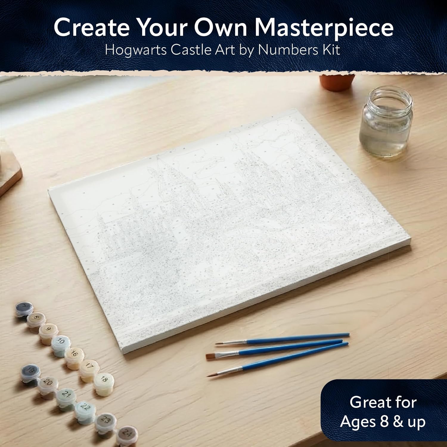 BEGINNER FRIENDLY PAINT BY NUMBER KIT: Enjoy creating your own masterpiece with this Harry Potter Hogwarts paint by number kit. This art by numbers kit will help you create a stunning work of art and decrease stress. Suitable for kids and adults INCLUDES EVERYTHING YOU NEED: Our paint by numbers kit are complete with 24 paint canisters, 3 high quality nylon paint brushes, pre-stretched 16" x 20" canvas on a wooden frame and the hanging kit to showcase your masterpiece once complete LOOKING FOR HARRY POTTER GIFTS? This Harry Potter paint by number kit is the ultimate gift for Harry Potter fans of all ages. Perfect for birthdays, white elephant, Holiday gifts, Christmas, weddings, parties, kids and adults will absolutely love receiving it 100% OFFICIALLY LICENSED HARRY POTTER MERCHANDISE: All our Harry Potter paint by number kits are designed by AQUARIUS, officially licensed, and 100% authentic. They're the perfect piece of Harry Potter collectible memorabilia to add to your collection