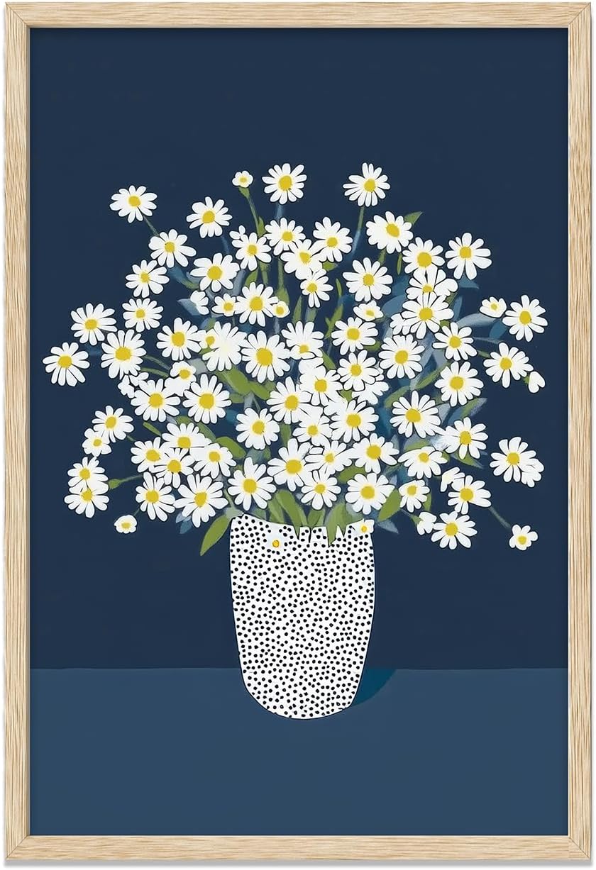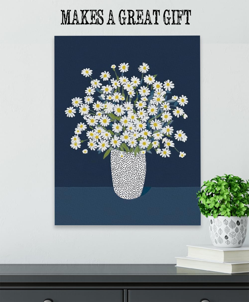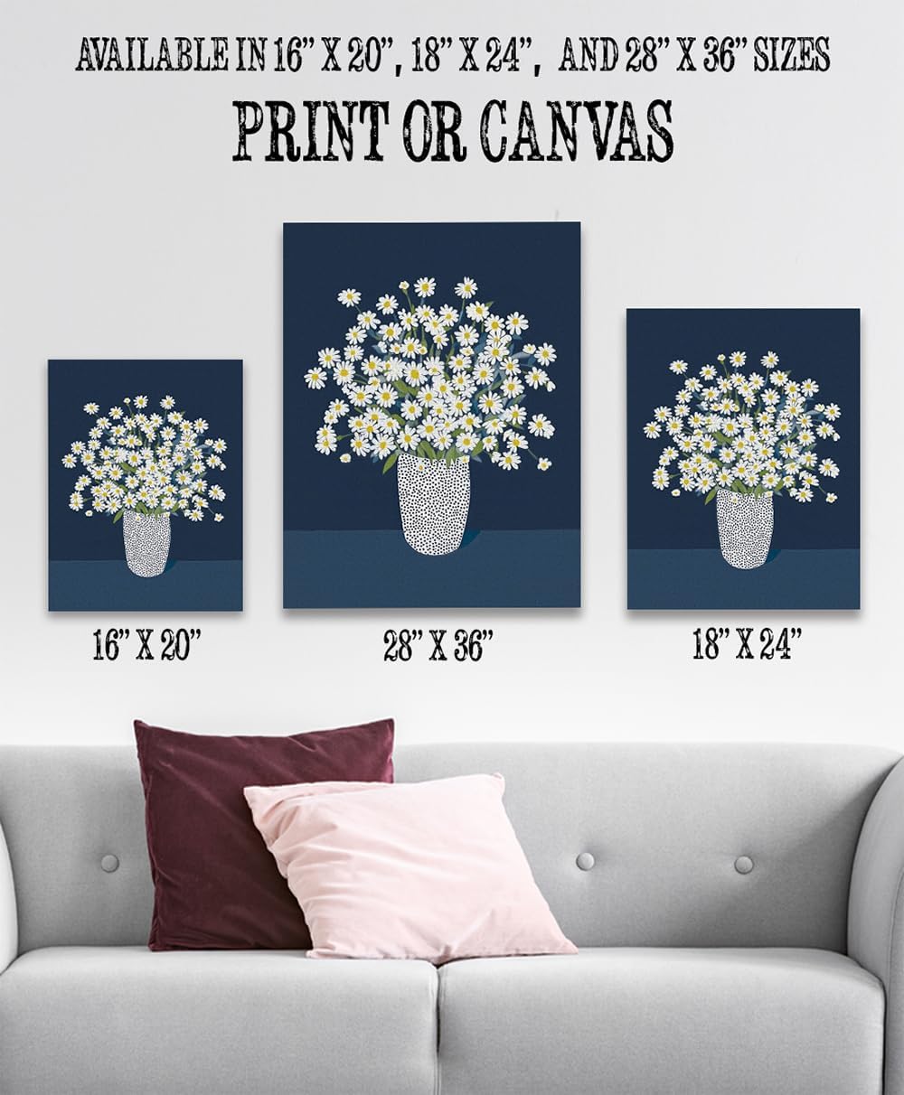 This stretched canvas poster showcases a beautiful blue and white daisy bouquet arranged in a charming polka dot vase, blending modern and minimalist styles to create a stunning piece of floral wall art. The artistic flower canvas features a white and yellow daisy print that captures the simplicity and elegance of nature, making it a standout addition to navy blue wall decor or any room in your home. With its Scandinavian floral art aesthetic and nature-inspired home decor design, this botanical minimalist art is ready to hang and crafted with real pine 1.5" stretcher bars for lasting quality. Whether as a cheerful flower poster for a living room or a thoughtful gift for occasions like birthdays, weddings, or housewarmings, this modern nature illustration is proudly made in Tomball, TX, by a dedicated team committed to excellence.