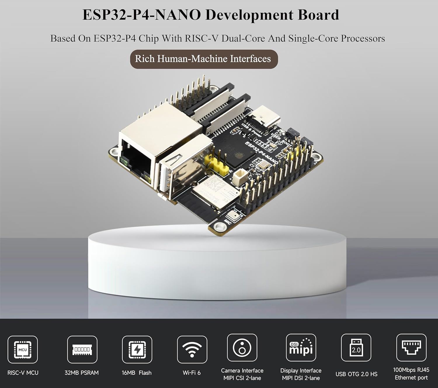 Description 1. ESP32-P4-NANO Development Board. Based on ESP32-P4 chip with RISC-V dual-core and single-core processors. 128 KB HP ROM, 16 KB LP ROM, 768 KB HP L2MEM, 32 KB LP SRAM, 8 KB TCM. And features rich Human-Machine Interfaces, including MIPI-CSI (with integrated Image Signal Processor) and MIPI-DSI interface. 2. It supports a comprehensive range of commonly used peripherals including MIPI-CSI, MIPI-DSI, USB 2.0 OTG, Ethernet, SDIO 3.0 TF card slot, microphone, speaker header and RTC battry header, etc. Additionally, it offers support for USB OTG 2.0 HS, Ethernet, and SDIO Host 3.0, facilitating high-speed connectivity. 3. The ESP32-P4 chip integrates the Digital Signature Peripheral and a dedicated Key Management Unit, ensuring secure data and operations. Specifically designed for high-performance and high-security applications, the ESP32-P4-NANO meets the advanced requirements of Human-Machine Interfaces, efficient edge computing, and increased IO-connectivity. 4. Security features: Secure Boot, Flash Encryption, cryptographic accelerators, and TRNG. Additionally, hardware access protection mechanisms help to enable Access Permission Management and Privilege Separation. 5. Powerful image and voice processing capability. Provides image and voice processing interfaces including JPEG Codec, Pixel Processing Accelerator, Image Signal. 6. 32MB PSRAM in the chip's package, with onboard 16MB Nor Flash. Adtaping 2*2*13 GPIO headers with 28 x programmable GPIOs. Onboard ESP32-C6-MINI module to extend 2.4GHz Wi-Fi 6 and Bluetooth 5/BLE for ESP32-P4, using SDIO interface protocol for communication, stable connection and efficient transmission. Comes with Online Tutorial Usage Guide and Online Development Resource, Please check: n9.cl/c11zy9 Package Content ESP32-P4-NANO x1 PoE module x1 8Ω 2W speaker x1 Screws pack x1