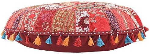 These are authentic styles Beautiful cushion studded with Heavy Embroidery, In this cover Vintage patches from old, valuable wedding saris & dresses are patched and stitched together at random to create a collage like effect and decorated with all kinds of colored , threads, patchwork, raised colored thread work and embroidery in intricate designs with beautiful tassel work. These are beautiful handmade cushion/pillow cover with rich embroidery and exotic jewel colors. Beautiful "Khambadiya" floor pillow made by hand by artisans in Barmer, India from carefully chosen and sown together patches from vintage saris, lenghas and wedding dresses. Witness the exquisite embroidery and thread work on a vibrant cotton backing, creating a stunning collage bursting with gorgeous patterns and colors!
