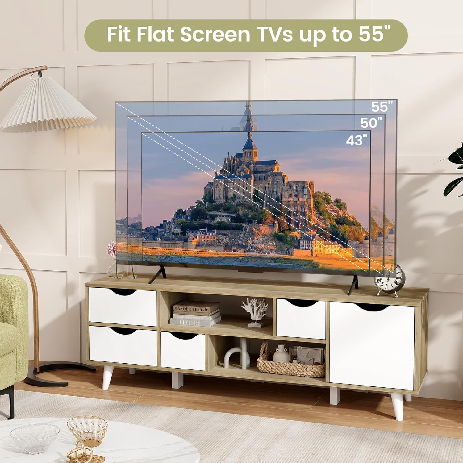 Description: Infuse your living space with our TV cabinet! Designed to fit flat screen TVs up to 55”, this media console table is a versatile addition to any living room or bedroom. Its timeless look, characterized by clean lines and a classic aesthetic, blends beautifully with various home styles. This TV cabinet boasts enclosed drawers and open compartments, providing ample storage space for your media items, gaming accessories or sundries, etc. The cabinet with adjustable shelf offers tailored space to organize your belongings. With 4 slanted support legs and 2 middle support legs, this entertainment center offers enhanced stability. this TV Stand serves as an elegant focal point that complements both the functionality and style. Features: This TV stand can hold flat screen TVs of 32”/43”/55” 4 drawers of various sizes keep books, collections and CDs in order 2 open shelves provide easy access for media items 3-position adjustable shelf for flexible storage solution Customize the cabinet space to fit your specific storage needs 6 legs enable a firm support and reliable structure Bottom protective pads for enhanced stability Door catch keeps the cabinet door firmly closed Cut-out handle makes it easy to open and close the drawer Comes with screw hole stickers for a clean look Mid-century design goes well with various room styles Ideal for living room, bedroom or reception room Specifications: Color: Oak Material: Engineered Wood, MDF, Metal Product Size: 48” x 12” x 16”(L x W x H) Dimension of Compartment: 16.5” x 11.5” x 5”(L x W x H) Inner Size of Large Drawer: 10” x 9.5” x 4”(L x W x H) Inner Size of Small Drawer: 5.5” x 9.5” x 4”(L x W x H) Dimension of Cabinet Door: 10.5” x 10.5”(L x W) Inner Depth of Cabinet: 10”, 11” Adjustable Range of Shelf: 1.3” Height Between Ground and Drawers: 4” Net Weight: 44 lbs Package Includes: 1 x TV Stand 1 x User Guide Why You Choose Our TV Stand with Drawers? √The open compartments and drawers facilitate storage for items. √The mid-century TV cabinet matches seamlessly with interior decoration.