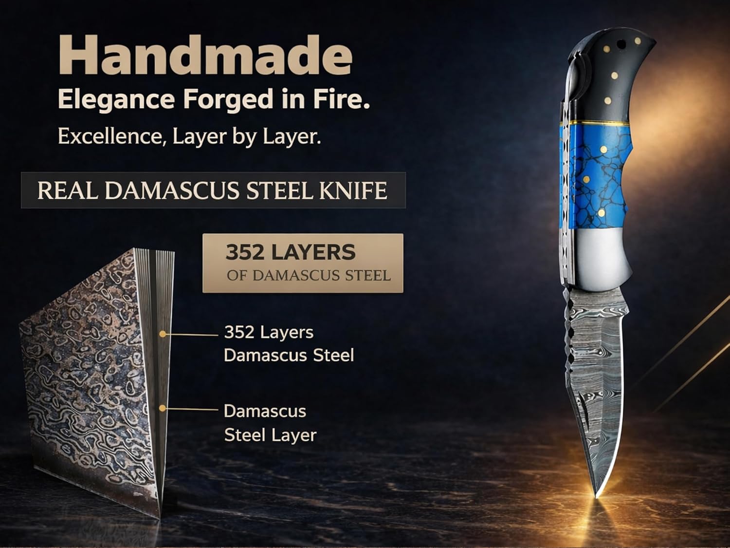 "Lara Eagle Damascus Knifes are handmade knife build from 133 layers of solid steel. These Hunting pocket knives are durable and attractive designed by experiences craftsmen. Unlike other low quality knife Lara Eagle knives are made of 15N20 & 1095 steel. Avilable in different attractive colors. You will never look for generic knives anymore once you help Lara Eagle knives in your hands. Unique Firm Grip design makes it easy for you to handle everyday tasks with little pressure.Excellent materials, unique design, pure handmade and three times of high standard quality testing is a good start of a great knife.. As knife lovers.We play pocket knives daily.We try to make a knife by ourselives.We design it and find others love our knives.We know why you love a knife as we do. Cool knife for camping, hunting, hiking, fishing, adventure, and home use; Men gifts for friends, dad, brother, boss, boyfriend, husband, father in law, hunter, fisherman, camping lover. Ideal gift for birthday gift, Thanksgiving day gift, Christmas gift and Stocking Stuffers.Easy Cleanup: Commonly used damascus knives takes too much time in cleaning, our hunting knives, offer easy clean up as thick leather cover protects it. Just wipe with a clean cloth and do quick oiling."